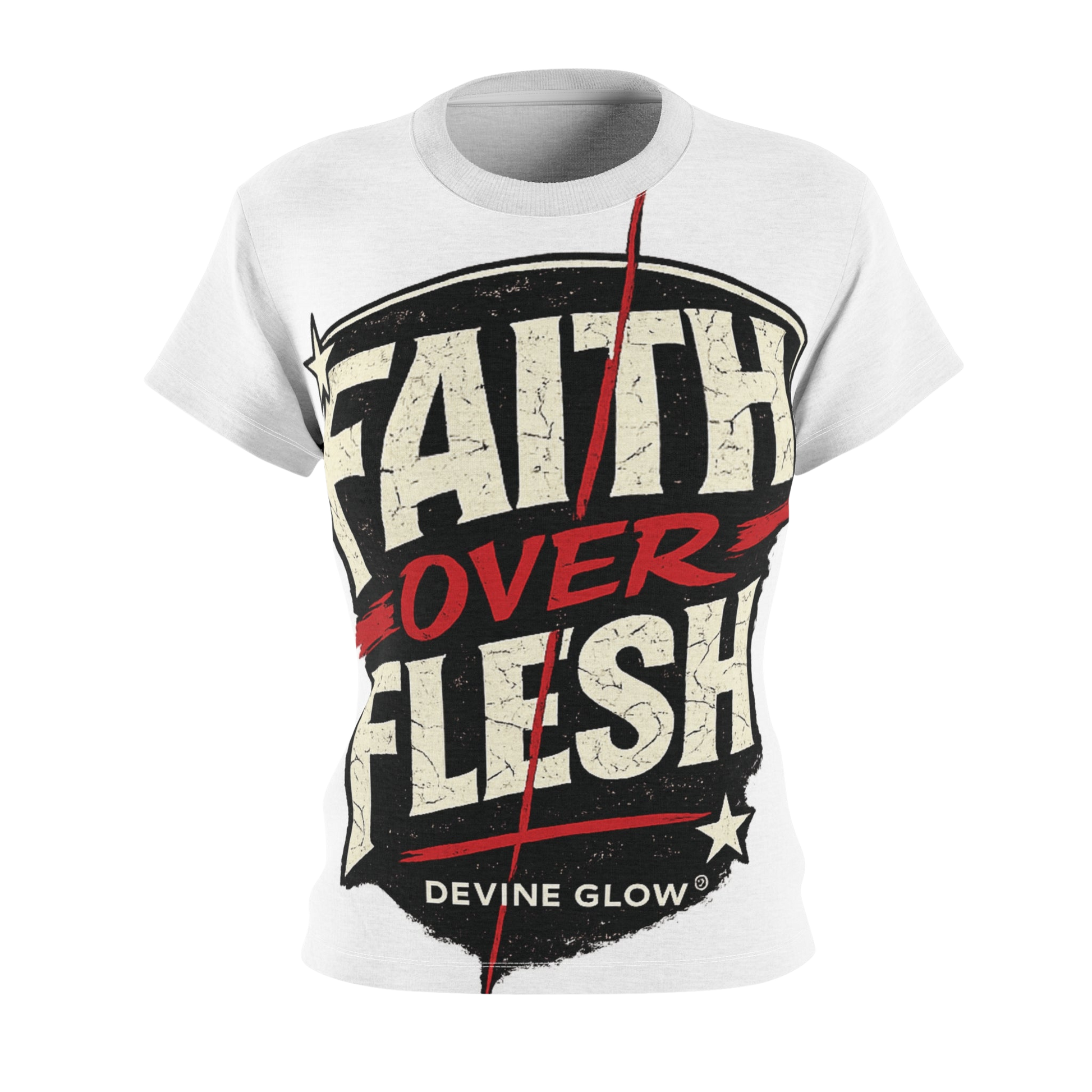 Faith Over Flesh Graphic Tee — Women's Cut & Sew Inspirational Shirt