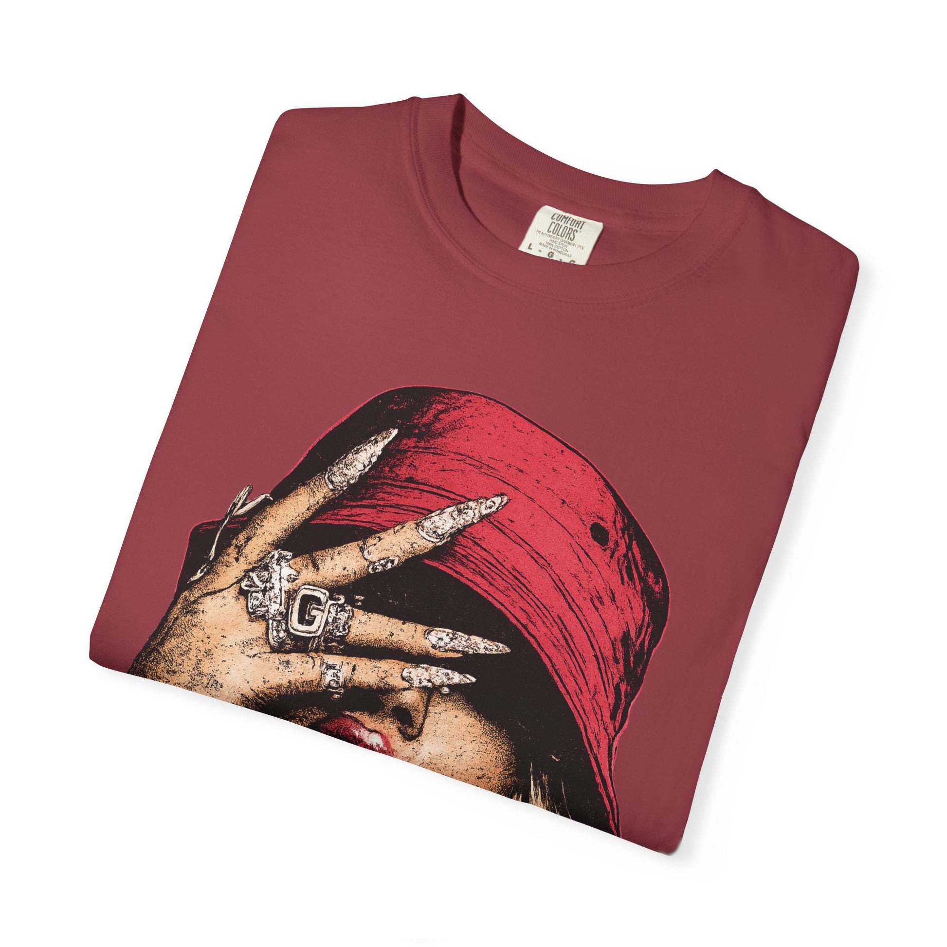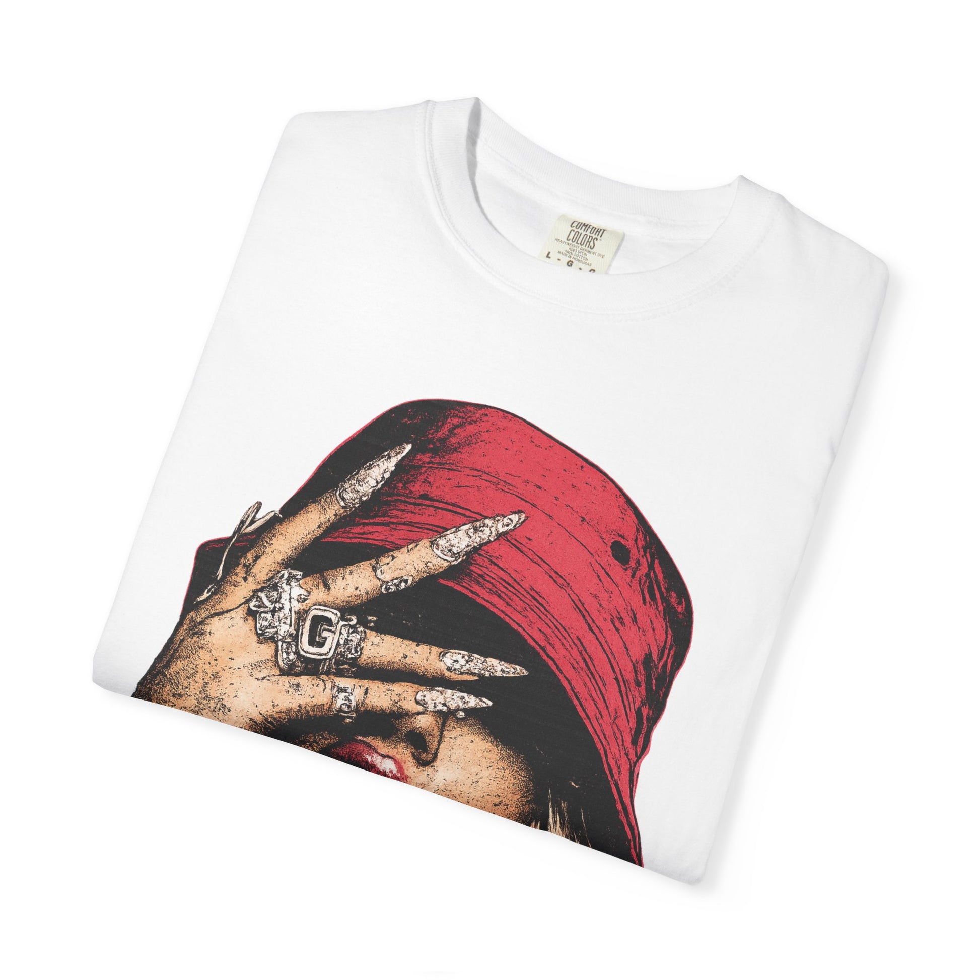 A relaxed, heavyweight tee with an attitude — this garment-dyed cotton shirt wears like a lived-in favorite from day one. The bold, graphic front shows a playful, rebellious portrait: a person with a red bucket hat, hand over one eye, tongue out and decked in chunky rings and a statement earring. The soft, washed color and textured finish come from the garment-dye process, while the tubular knit and double-needle stitching ensure a sturdy, no-fuss silhouette that holds up to everyday wear. Sized from S to 4XL and offered in many colors, it layers easily under jackets or stands alone as the focal point of a streetwear look. It’s for people who love music, edge, and texture — a tee that reads loud in photos, at shows, or out with friends.